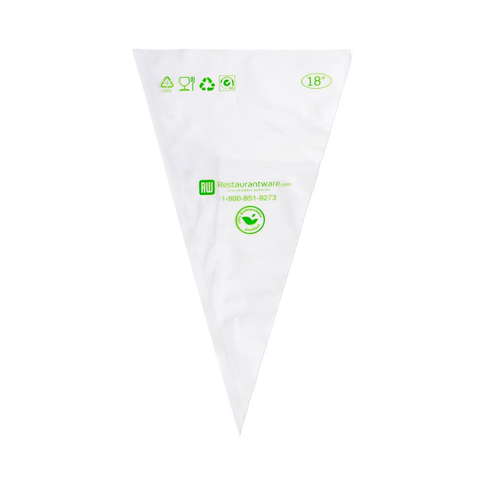 Pipe sweet swirls and dynamic ruffles in an eco-friendly way with our Pastry Tek Clear Biodegradable Pastry Piping Bags. Featuring a commercially compostable and biodegradable construction, these disposable pastry bags are great environmentally friendly options for any bakery, cafe, cake shop, and more. With a durable design, you can rely on these plastic piping bags to keep their shape and avoid tears when cutting the tip to any size. These disposable frosting bags offer a clear view for when you have to refill sweet icings and provide a slip-resistant grip to easily decorate treats. Perfect for managing waste, these cake decorating bags biodegrade in a commercial composting facility to meet the standards of your environmentally-conscious customers. Measuring 18 inches long by 8.75 inches wide, these icing bags ship in a bulk 100 count box.