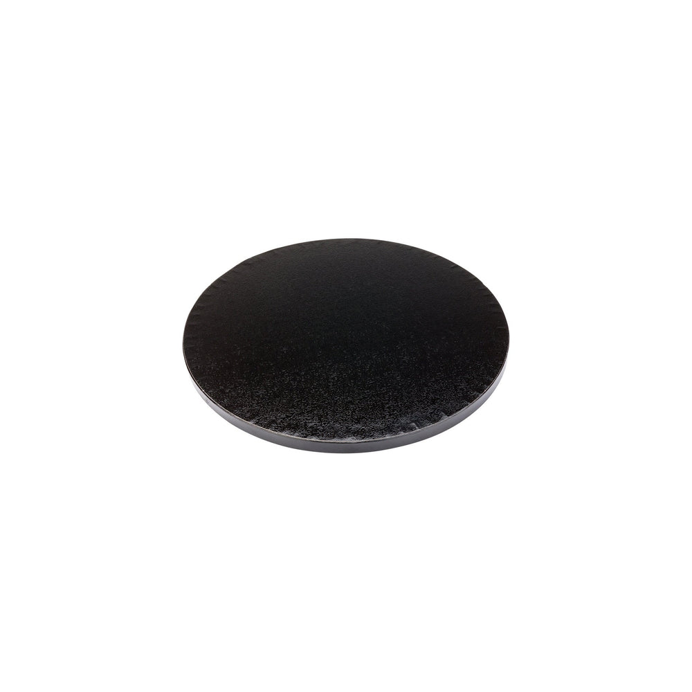 Reliably transport professional cakes with our Pastry Tek Round Black Cardboard Cake Drum Board. With a sturdy cardboard base, this grease-resistant black cake drum is great for frosting detailed designs on a birthday cake at a bakery or for displaying a coffee cake at a cafe. This 10-inch cake board features a covered edge that effectively captures excess frosting without trapping it in the crevices. With a sleek black finish, this versatile cake drum effortlessly complements the vibrant colors on scrumptious cakes to create a stunning presentation. This cake base is conveniently recyclable and provides a quick cleanup at your restaurant, coffee shop, or other food service establishment. Ideal for easily laying and decorating an 8-inch cake.
